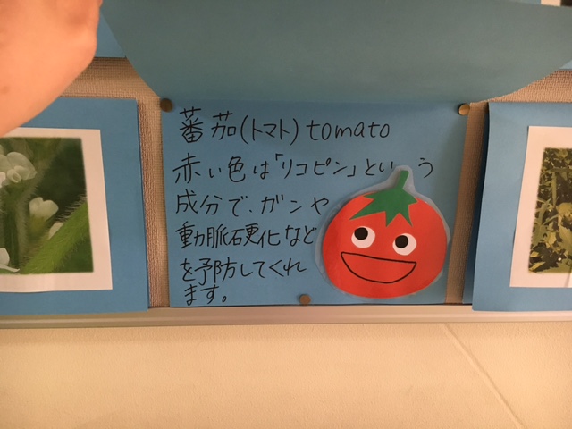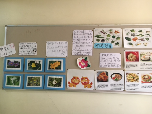 給食室前の掲示物を夏バージョンに変えました。先週の沖縄料理についてや、花から夏野菜を当てるクイズを作ってみました。
