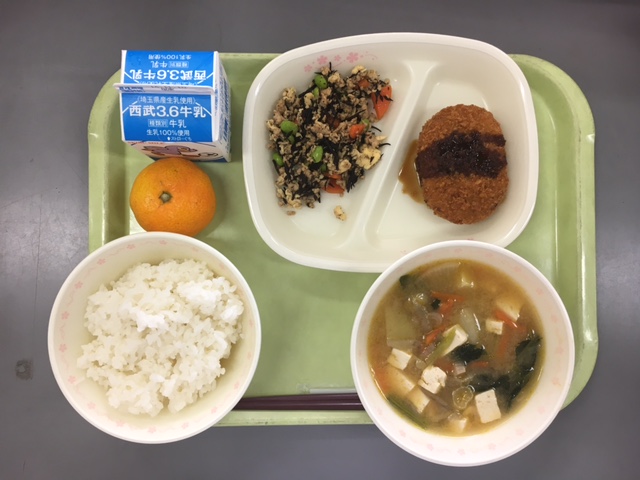 ごはん・かぼちゃコロッケ・ひじきのそぼろ煮・野菜椀・みかん・牛乳でした。