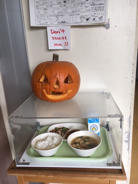 月曜日は、ごはんの日なので、考え抜いた末にかぼちゃのコロッケとジャック・オ・ランタンに見立てたみかんをつけてみました。アメリカの行事なので、和食だとこじつけた感じはありますが、生徒たちは喜んで食べていました。