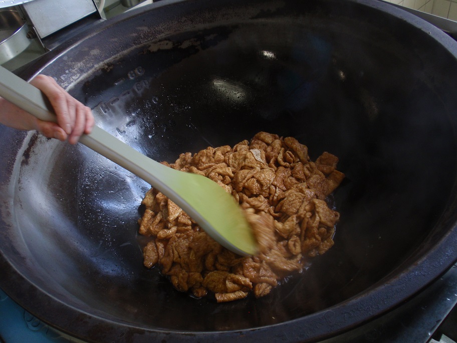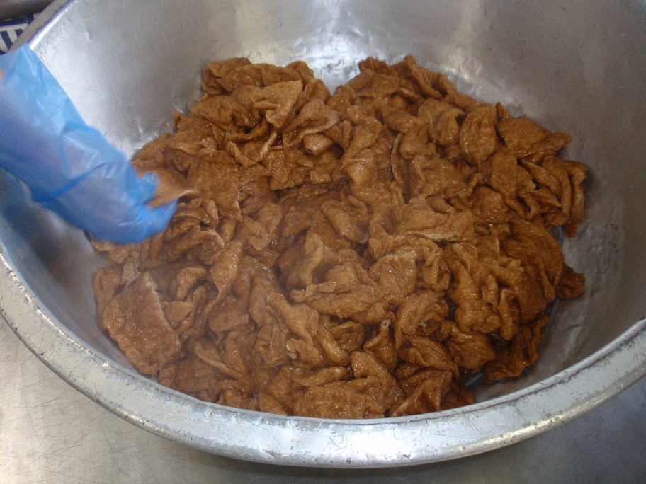 きつねうどんの油揚げは、油抜きをしたあとに甘辛く煮付けています。