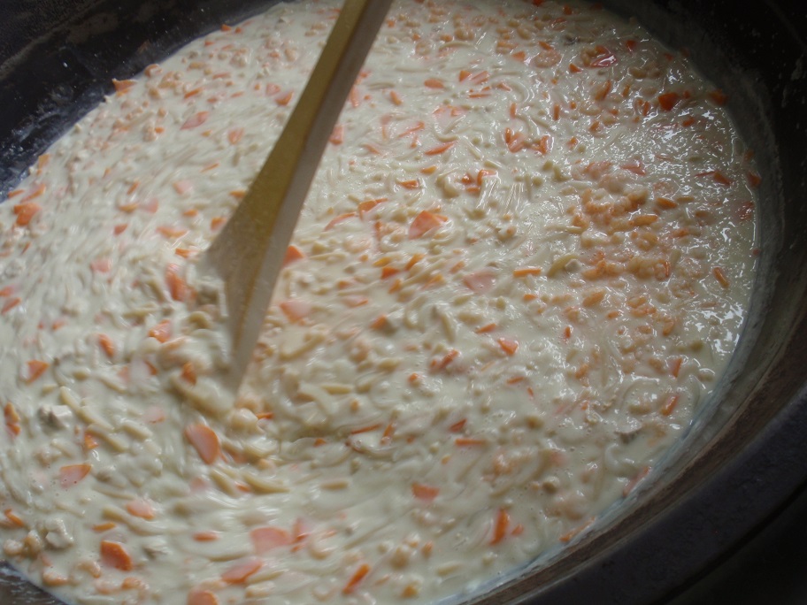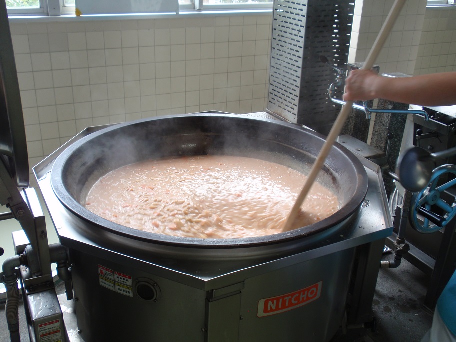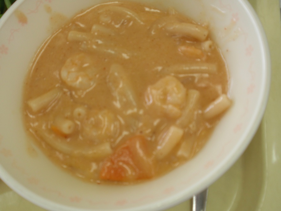 マカロニのヒリヒリ煮は、シチューベースで豆板醤など辛みのある調味料で味付けしています。