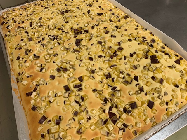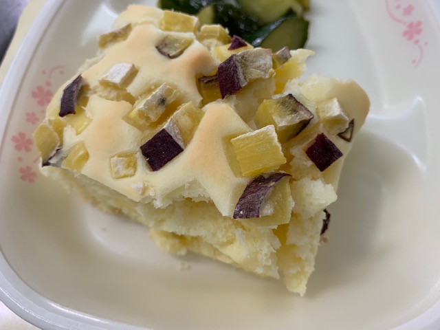 カルシウムパンケーキは、さつまいもとチーズが入っています。表面には、四角く切ったさつまいも、中にはチーズがたっぷり入っています。