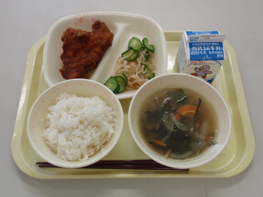 カレーピラフドリア風 牛乳 フライドチキン クリスマスサラダ 野菜コンソメスープ セレクトデザート (クリスマスチョコケーキ・いちごクレープ・ぶどうゼリー) エネルギー:653kcal たんぱく質:24.7g 脂質:19.9g 炭水化物:98....